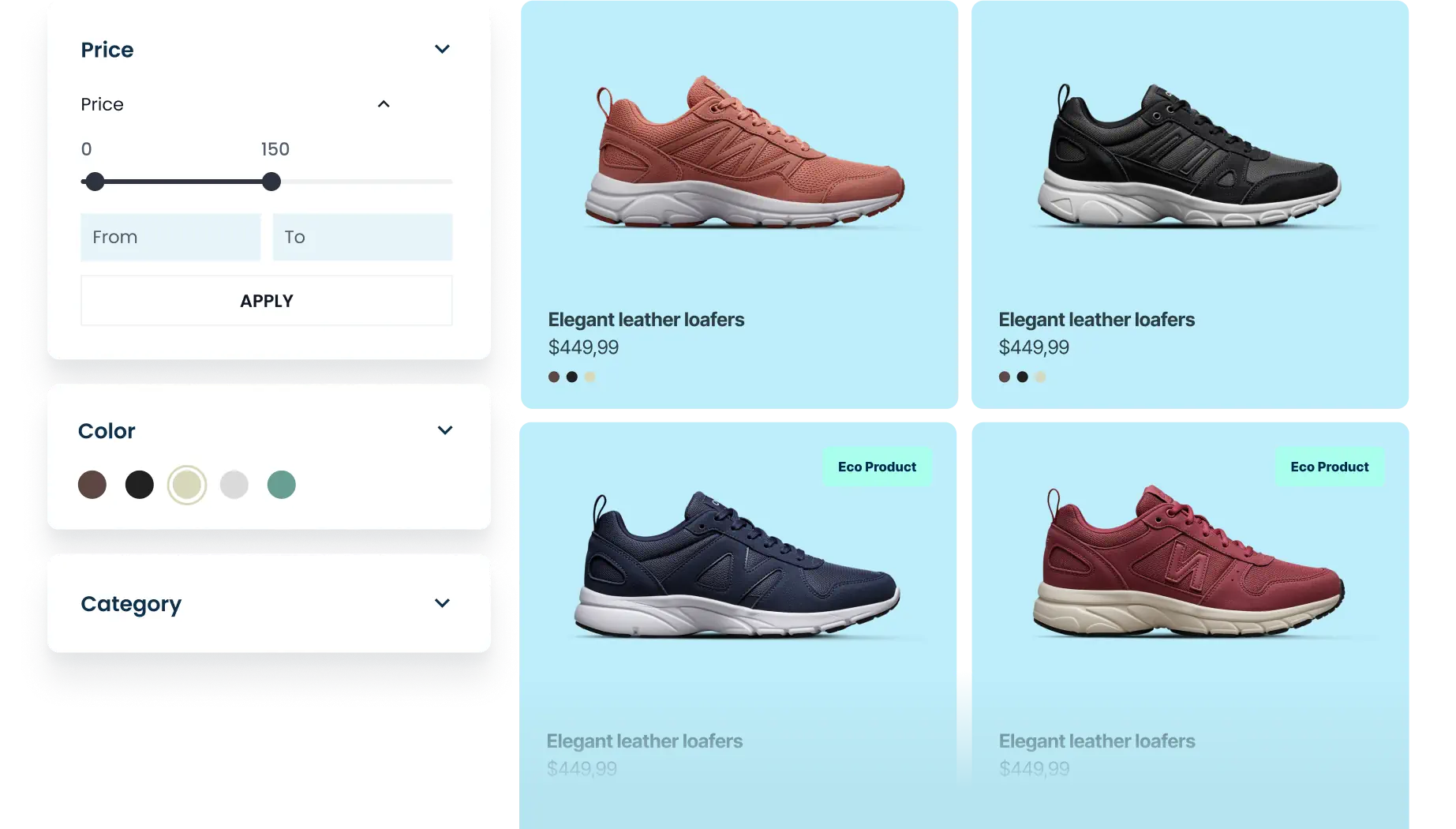 Let your visitors change the number of products per page, layout & display filters, all without reloading the page. Display all options at once or just one of them, exactly as you need.
