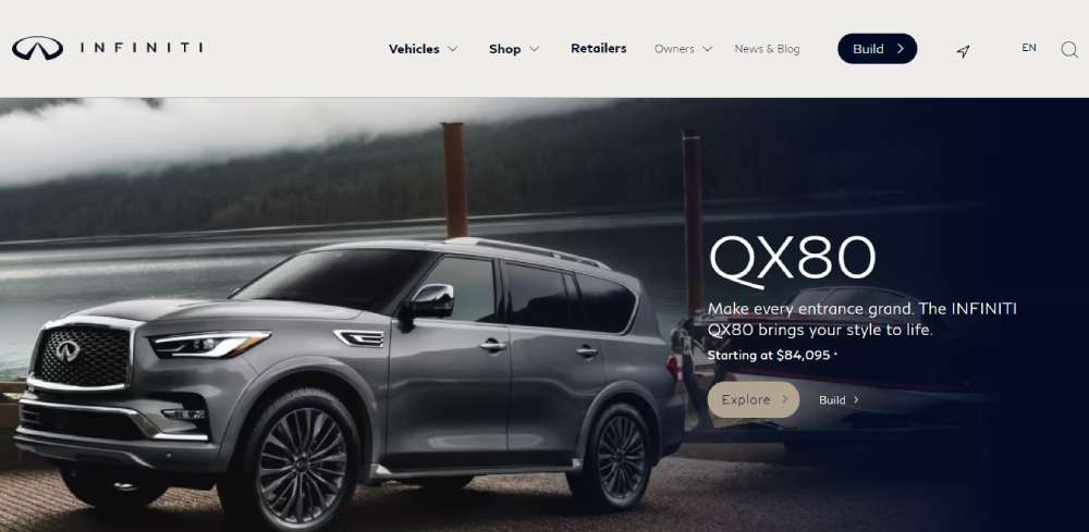 Infiniti's digital footprint radiates luxury and performance. Clear visuals of the latest models against a sleek black backdrop, coupled with a savvy font choice, exude an air of sophistication that's hard to miss.