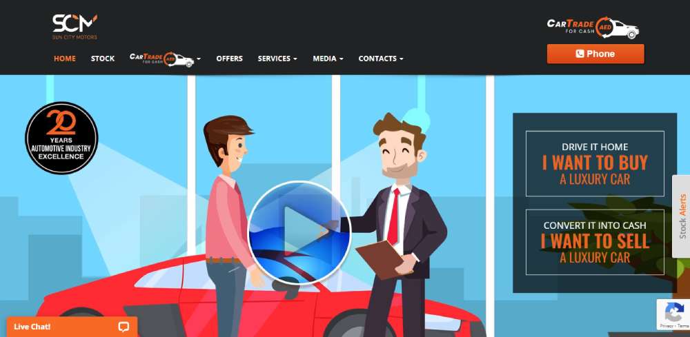 Luxury's got a new address with Sun City Motors. Their website, with its image slider and animated film, shows you why. The call-to-action messaging is hard to miss, and the live chat and color palette all come together to make a sleek web design.