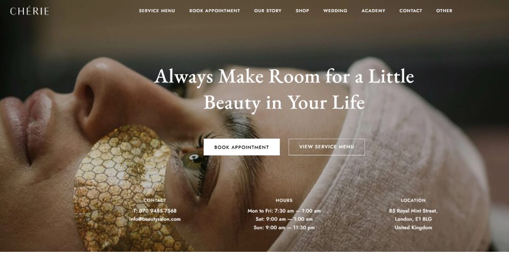 The hero section is the first thing visitors see. For beauty sites, this needs to be image-heavy with a clear call to action button, usually "Book Now" or "Shop Products."