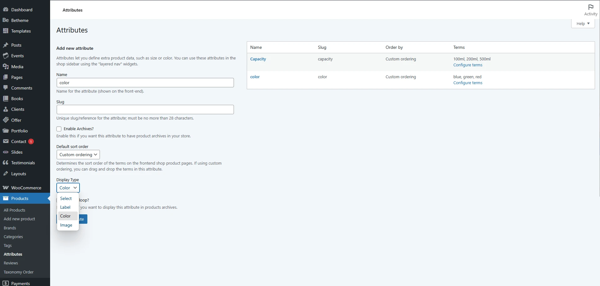 Navigate to Products > Attributes. When adding a new attribute (e.g., “Color,” “Capacity,” or “Cover”), pay attention to the Display Type field. Betheme allows you to choose from three additional formats beyond the standard “Select” type:
