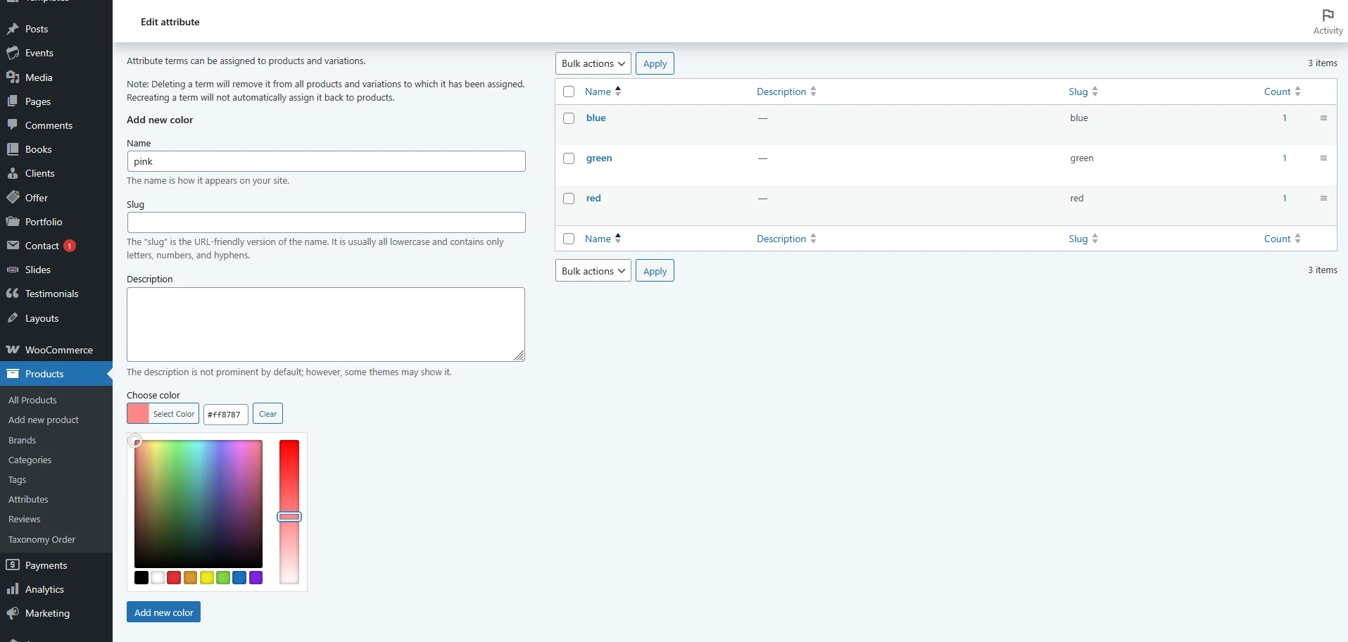 Click Configure terms next to your chosen attribute.When adding a new term (e.g., “Pink” for a color or “First cover” for an image), you will see additional options: