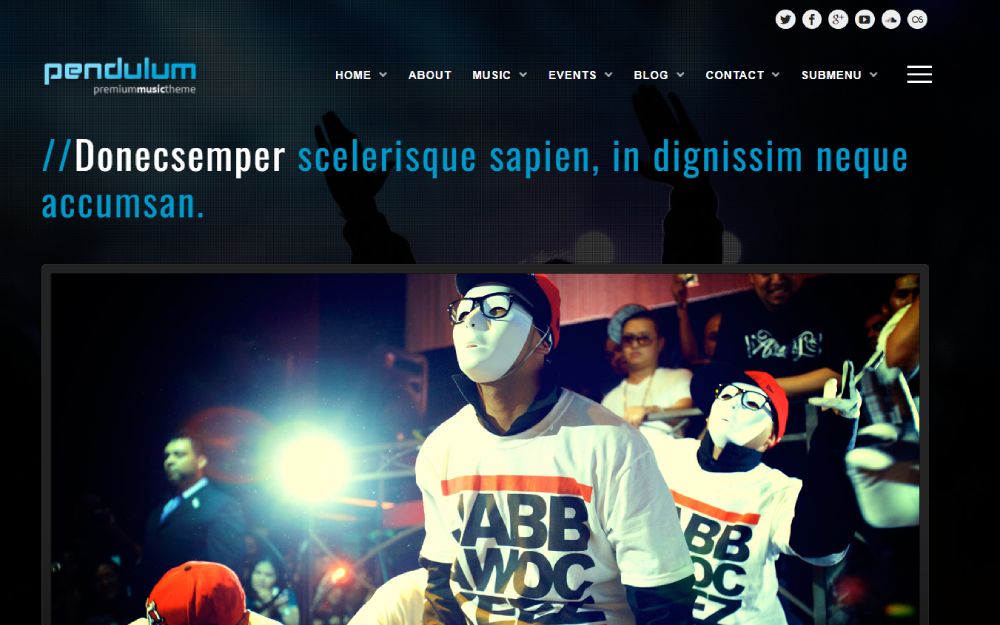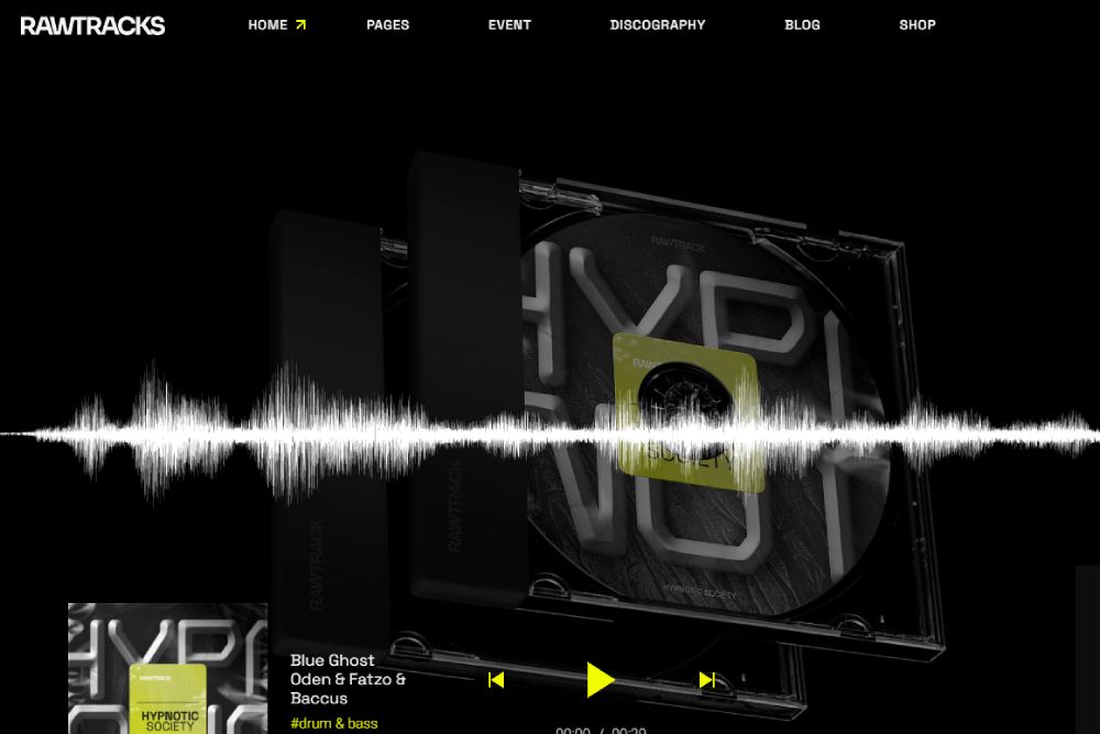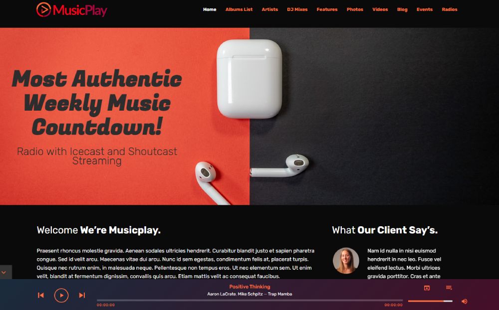Most templates ship with a built-in music player featuring waveform displays, playlist support, and volume controls.