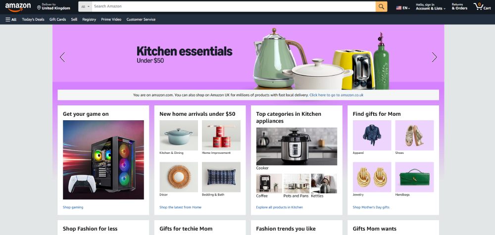 Their category landing pages (like "Best Sellers in Kitchen") rely on personalized product grids, recommendation blocks, and dynamic pricing. The design is dense, data-heavy, and optimized for information over aesthetics.