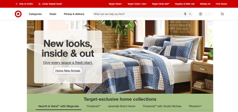 Target sits somewhere between Nike's editorial approach and Amazon's data-driven grids. Their seasonal landing pages (back-to-school, holiday gifting) mix curated product picks with lifestyle photography and clear category links.