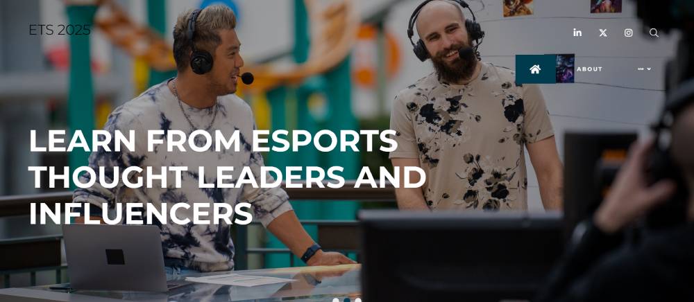 Dynamic header with video background captures gaming energy. Section transitions use parallax scrolling effects. Two-column layouts balance text content with visual elements. Sponsor showcase uses logo carousels with consistent sizing. Registration form breaks complex process into multi-step progression.