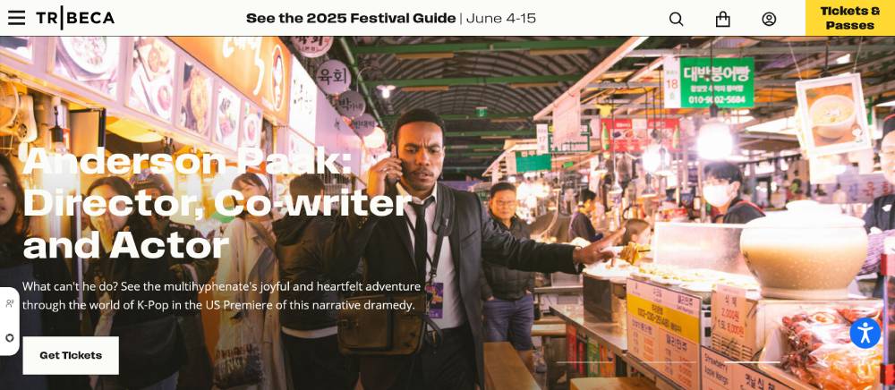 Clean, minimalist design with film-focused imagery. Typography uses sans-serif fonts with clear hierarchy. Content blocks organized in asymmetrical grids. Navigation structure balances simplicity with comprehensive event information. Interactive elements include expandable sections for schedule details and filmmaker information.
