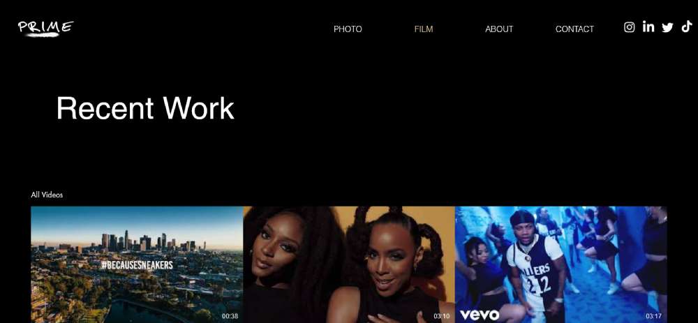 Prime, an Atlanta-based video content creator, showcases a blend of music, fashion, and commercial projects on his website. The mix of static images and video highlights against a dark background? It's a digital portfolio that showcases his diverse and extensive work in videography.