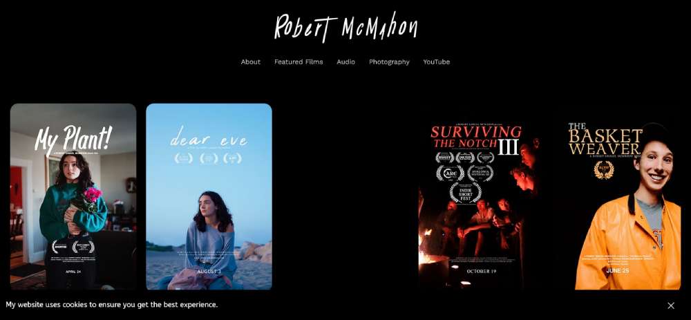 Robert McMahon's site is his personal portfolio stage. It's clean, it's crisp, and it's all about his film and documentary work. Clickable posters, social links – it's a filmmaker's digital haven.