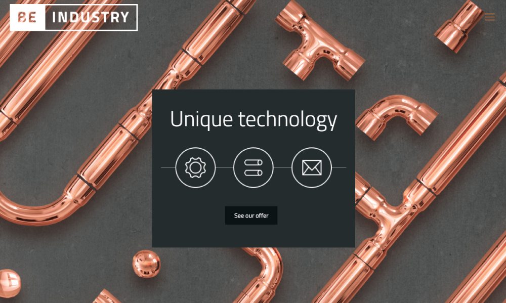 You will notice bold geometric shapes, strong grid layouts, and full-width image sections. The hero section typically features machinery, facilities, or workers in action.