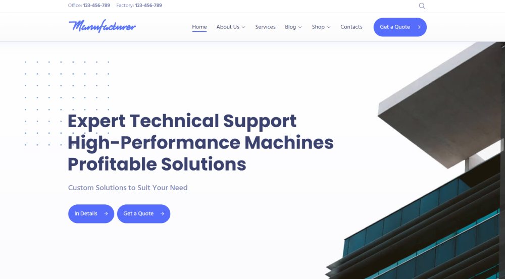 These pre-built layouts include everything heavy industry sectors need. Project galleries, quote request forms, equipment showcases, and B2B contact sections ready for customization.