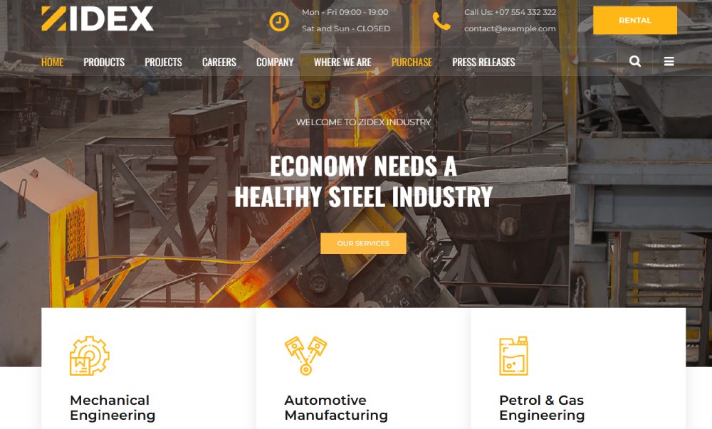 Manufacturing, construction, steel production, oil and gas, mining, logistics, and warehouse operations. Engineering firms and plumber websites also use industrial-style layouts for their service businesses.