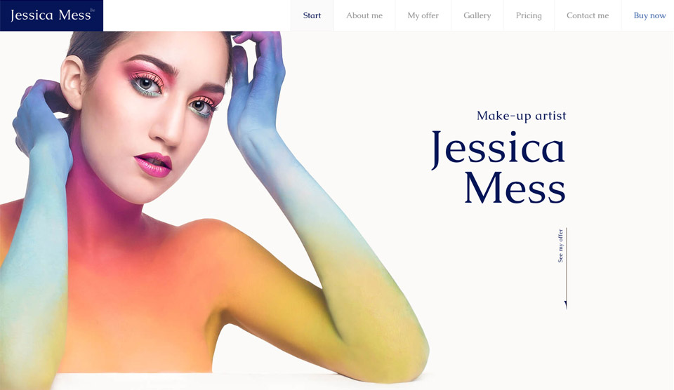 This one-page website is dedicated to the professional makeup artist. The information you need to know about this business is clearly presented. Icons point you to the services available, followed by the gallery, pricing information, business location, and the contact information.