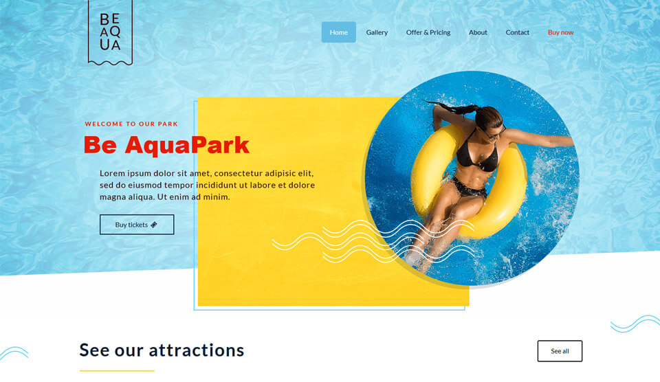 A welcoming statement and introduction, an image depicting fun and enjoyment, a menu, and even a call to action, all fit nicely on this home page, while still leaving plenty of open space. The main attractions are well presented. The See All button invites you to investigate the attractions in greater detail. There’s also a map and pricing information.