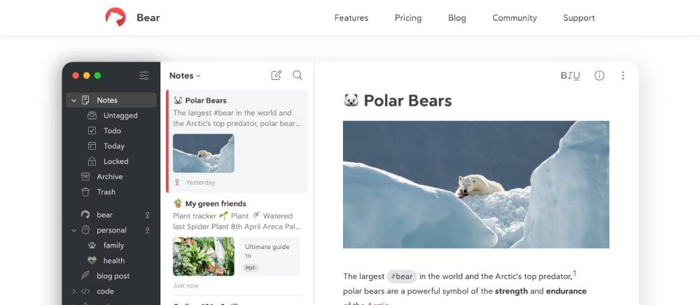 Warm color accents against neutral backgrounds. Actual note examples show the app's capabilities directly. Device frames present the interface in context. Typography showcases the writing-focused nature of the app. Navigation stays extremely minimal to emphasize content creation.