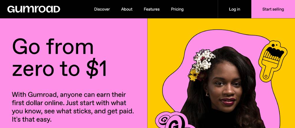 Creator-focused design with example products featured prominently. Purple brand color used strategically for calls to action. Layout demonstrates both buyer and seller experiences. Typography stays readable for extended content. Mobile view optimizes for discovery browsing.