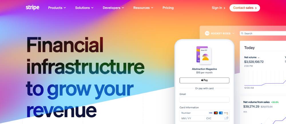 Dynamic gradient backgrounds with smooth color transitions. Code snippets appear directly in the interface demonstrating implementation ease. Navigation stays minimal despite complex offerings. Animated elements respond to cursor movement. Device mockups show the product in real contexts.