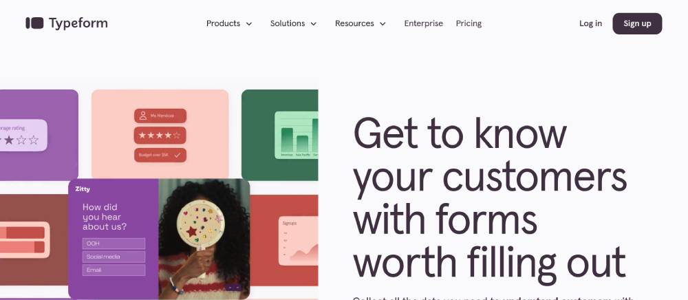 Interactive elements demonstrate the question flow experience. Rounded corners create a friendly, approachable feel. Bold typography with high contrast for readability. Color blocks separate functional areas clearly. Homepage includes working examples of form interactions.