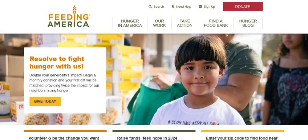 Feeding America – these folks are the superheroes of hunger relief in the U.S. Their site? More than a website, it's a lifeline. Mobile pantries, disaster relief, SNAP assistance – you name it. It’s a standout in Hunger Relief Non-Profit Web Design, making sure no one goes hungry.