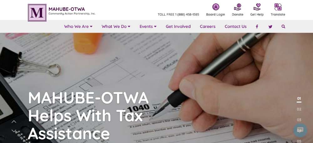MAHUBE-OTWA? It's all about consistency and accessibility. Purple and white theme, spot-on with their logo. It's a mix of Community Assistance Programs and Professional Non-Profit Branding. Easy navigation, clear call-to-actions – "Board Login", "Donate", "Get Help", "Translate" – they're all about helping people connect and get things done.
