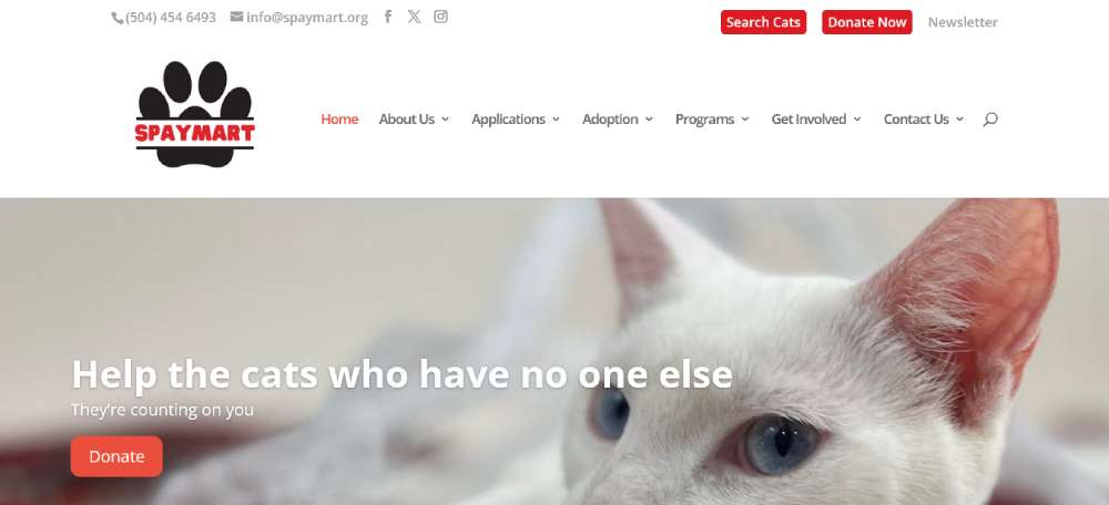SpayMart – it's all about the felines. And their site? Cuteness overload with kitty pics everywhere. Bright, simple colors that just pull you in. It's like every click on their site nudges you to adopt, donate, or just go “aww.” They’re mastering that Animal Welfare Non-Profit Design, making you wanna be part of their cat-loving crew.