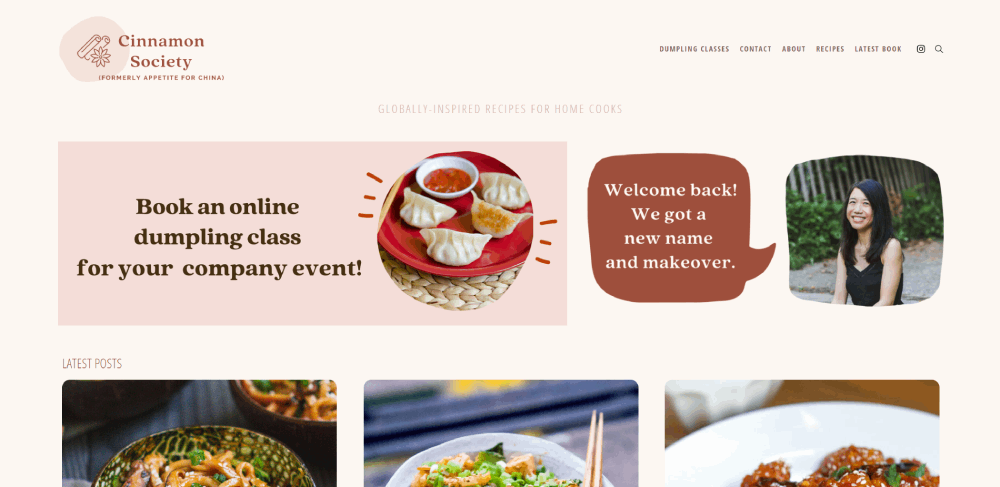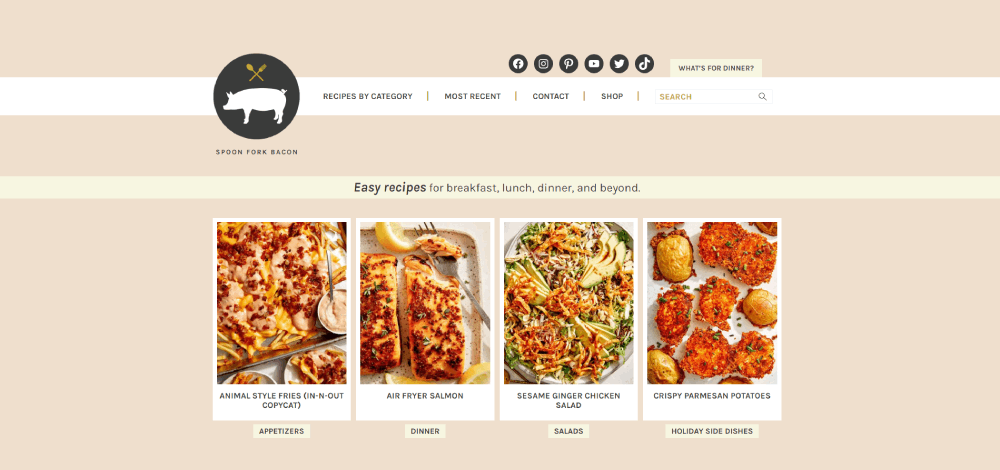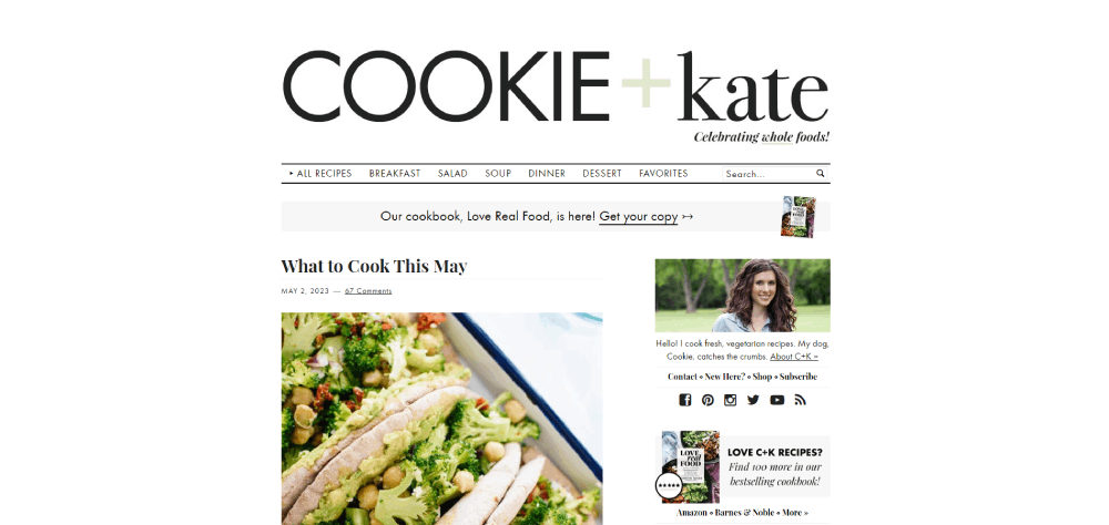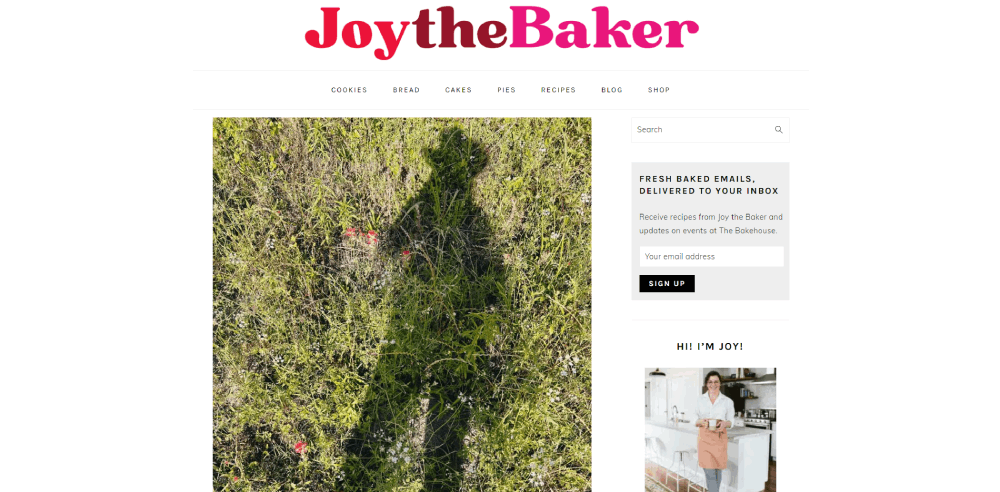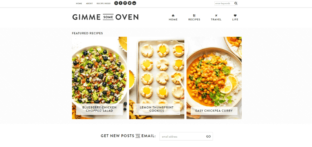 This fun food blog shares seasonal food recipe ideas. The homepage design uses a boxed layout, which looks well-organized and makes it easy to navigate. Instead of featuring the latest blog post in the hero header, Alexandra Cooks features a subscription block. This food blog also makes good use of images to entice visitors to keep looking around.