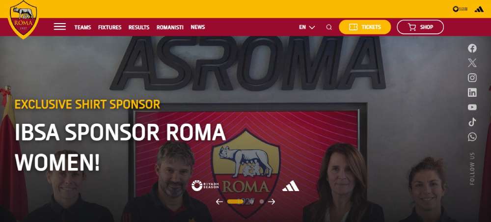 AS Roma – The site’s navigation is almost invisible, which is genius. It draws your eyes straight to the ‘Tickets’ and ‘Shop’ buttons. And don’t miss the hamburger menu; it's packed with key info.