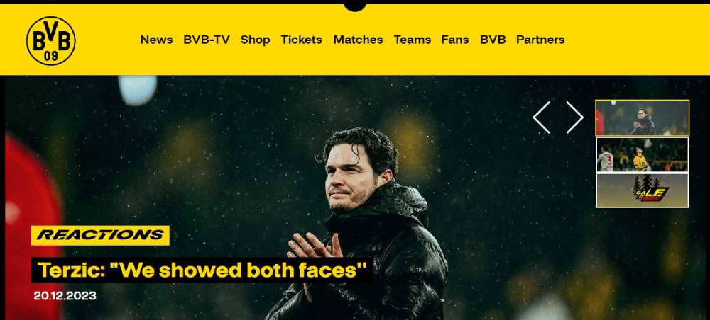 Borussia Dortmund – Their site? It's a head-turner with its asymmetrical layout. Feels more like a dynamic sports news portal. You land there, and bam! Scores and next game dates are right up top, no need to scroll.