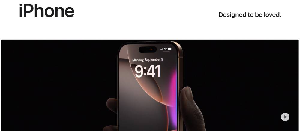 Product-centric layout with cinematic photography. Parallax scrolling creates depth without distraction. Typography stays minimal with signature San Francisco font. Video elements blend seamlessly with static content. Mobile version maintains visual impact while simplifying navigation.