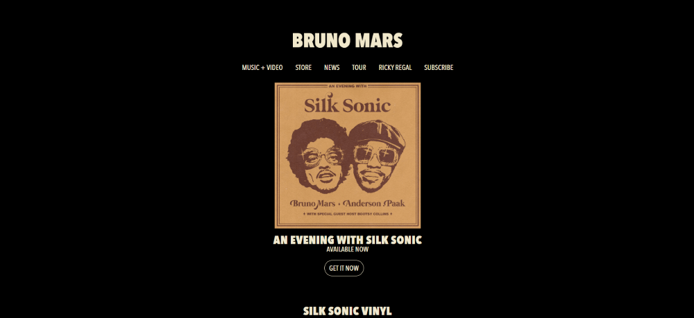 Global superstar, Bruno Mars, has been able to blend different genres and create catchy grooves that take the listener back in time to the glory days of disco, funk, and Motown. Websites for singers should be straightforward and this site is no exception.Fans can shop, listen to tunes or look up dates on upcoming events.