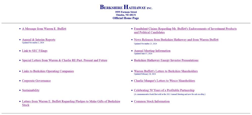 The website for Berkshire Hathaway is unremarkably simple with a design that feels like a placeholder. It lacks creative elements and engaging visuals, resembling more of a plain directory filled with several hyperlinks. While it performs better on mobile, the desktop experience leaves much to be desired.