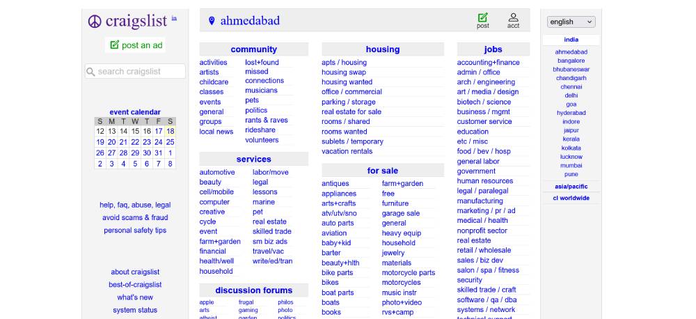 Despite being a significant player in online classifieds, Craigslist's design feels perpetually stuck in the late 90s. The website’s layout is unimaginative and cluttered, lacking visual appeal and coherent navigation. Its basic, text-heavy interface might have nostalgic charm for some, but overall, it fails to meet modern design standards.