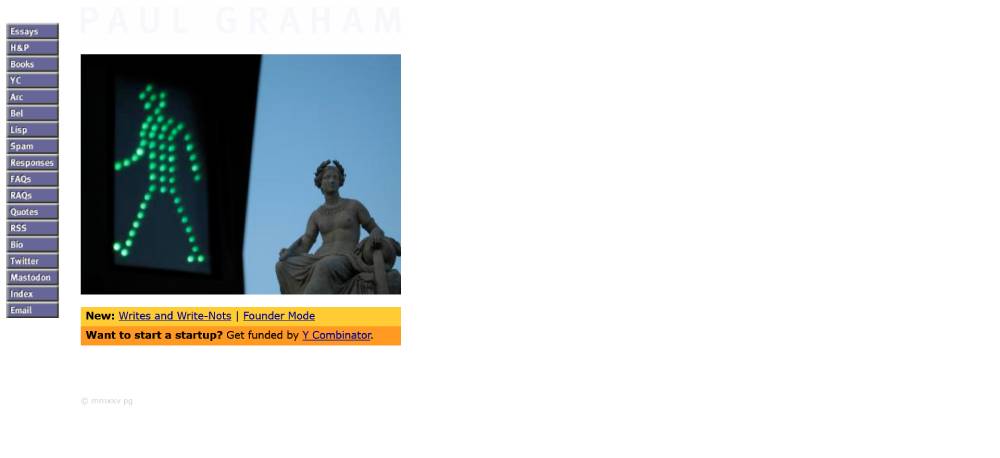 Paul Graham’s site is hindered by tiny text and an overly condensed menu, making navigation difficult and unpleasant. The design is plain and uninviting, offering little to retain users or entice them to explore further.