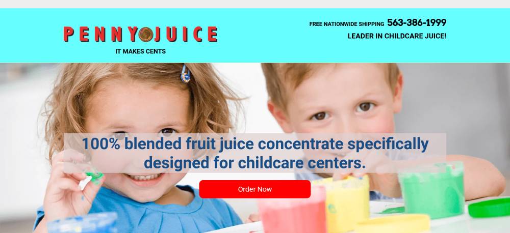 Penny Juice’s website falters with an intrusive header and unappealing font and color choices. The overall design is unprofessional, making it difficult to discern the business's nature without prior knowledge. It screams for design overhaul, from the header to the poorly optimized mobile performance.