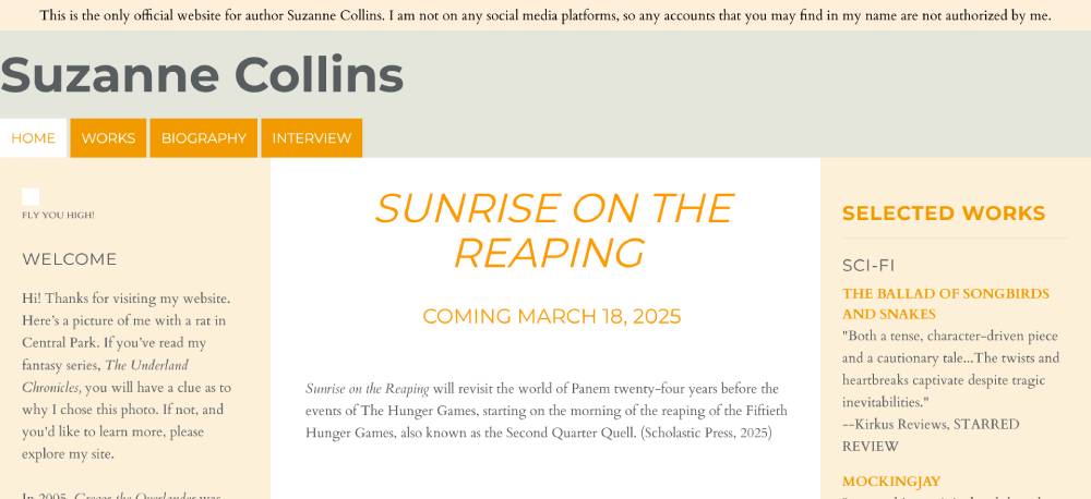 Suzanne Collins’ author website is surprisingly basic, more reminiscent of a free blog page than a portal for a world-renowned author. With minimal design and call-to-action buttons, it fails to engage visitors or provide an immersive literary experience.
