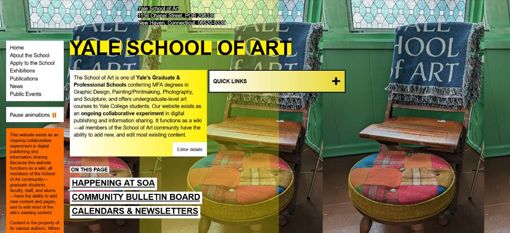 Yale University's School of Art website is an outdated jumble of mismatched colors and disorganized content. The bizarre layout, small font, and unattractive backgrounds impede easy navigation, leaving visitors struggling to find relevant information. Even its mobile version delivers a subpar experience.