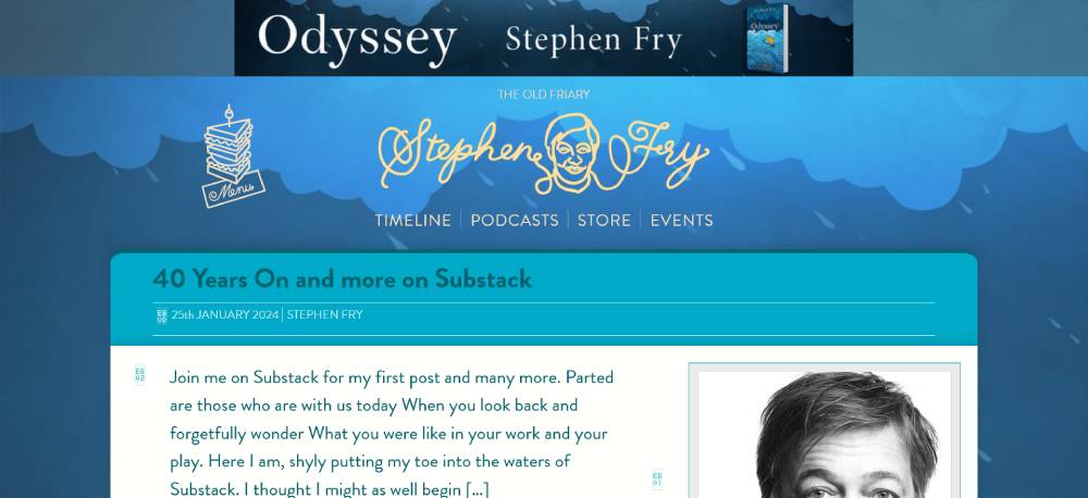 Stephen Fry’s website suffers from a messy, confusing design. The layout lacks a cohesive structure which diminishes user experience significantly, falling short of reflecting the elegance and wit associated with Stephen Fry.
