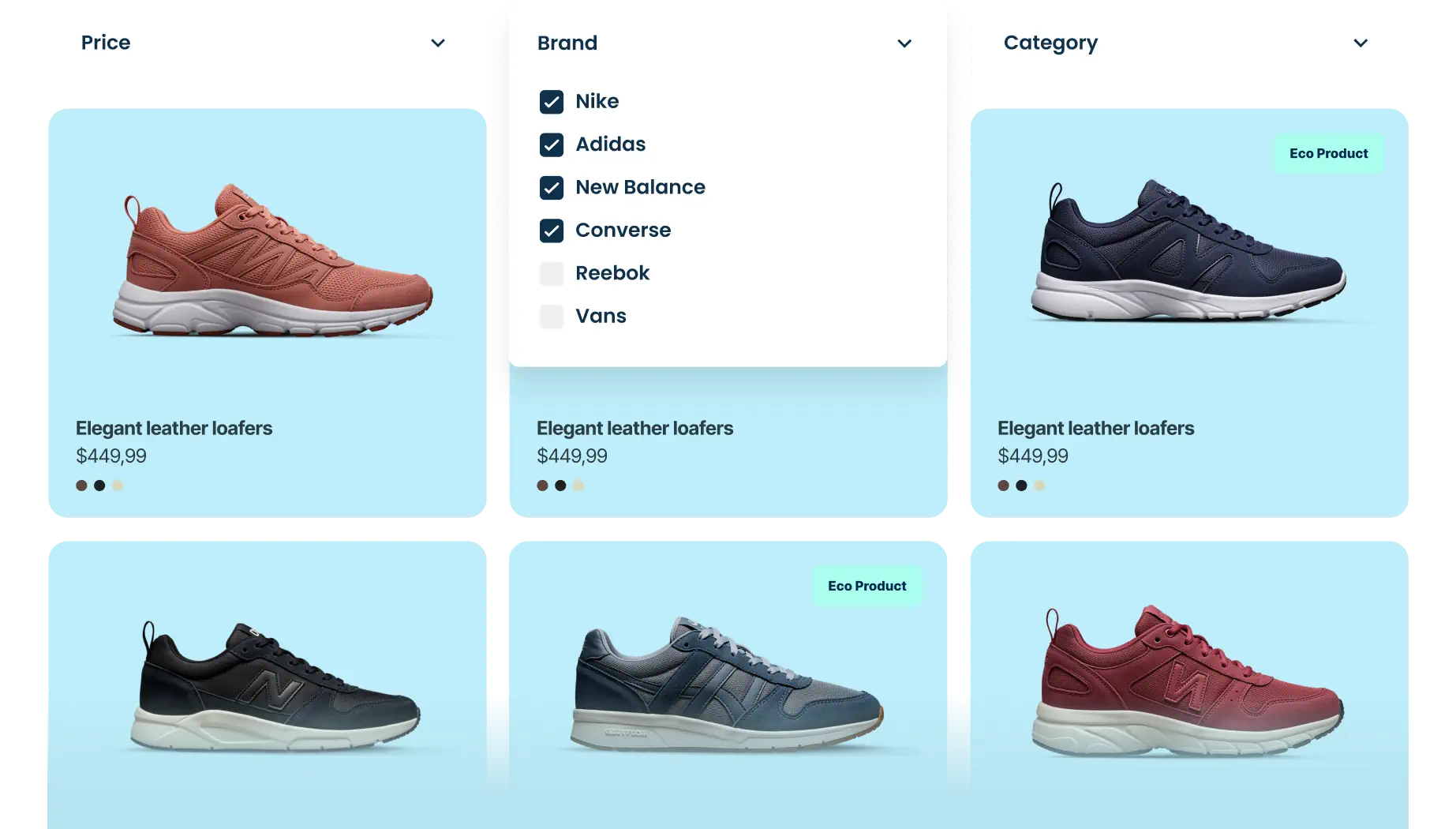 Let your visitors change the number of products per page, layout & display filters, all without reloading the page. Display all options at once or just one of them, exactly as you need.